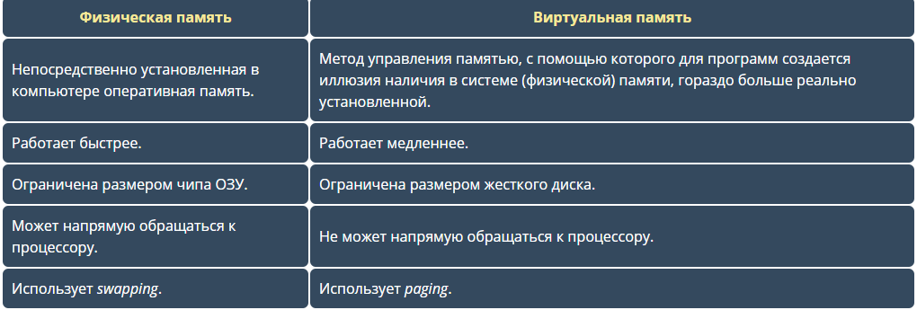 Основное различие между физической и виртуальной памятью заключается в том, что физическая память относится к оперативной памяти компьютера, подключенной непосредственно к его материнской плате.